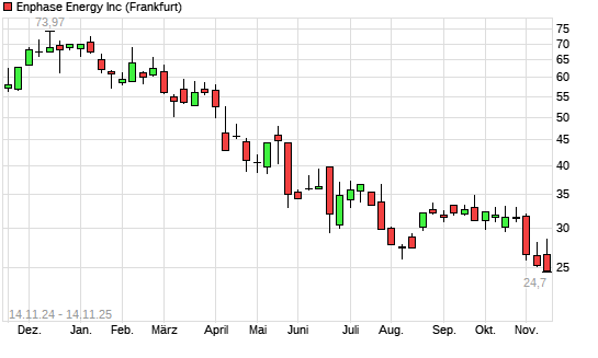 Mit dem Rücksetzer auf 24,80 EUR hat die Enphase Energy-Aktie (ISIN US29355A1079) am 13.11.2025 ein neues 5-Jahres-Tief erreicht und damit den Kurs vom 05.11.2025 eingestellt.