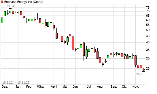 Mit dem Rücksetzer auf 23,87 EUR hat die Enphase Energy-Aktie (ISIN US29355A1079) am 17.11.2025 ein neues 5-Jahres-Tief erreicht und damit den Kurs vom 14.11.2025 eingestellt.