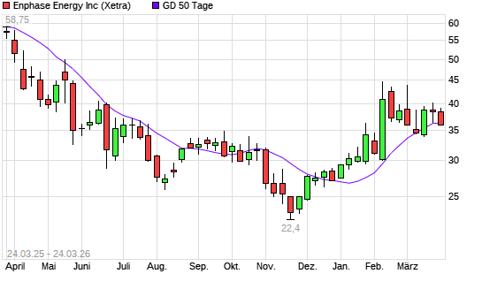 Mit dem Rücksetzer auf 35,03 EUR hat die Enphase Energy-Aktie am 23.03.2026 die 50-Tage-Linie nach unten gekreuzt.