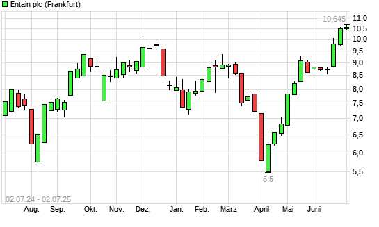 Mit dem Anstieg auf 10,62 EUR hat die Entain-Aktie (ISIN IM00B5VQMV65) am 01.07.2025 ein neues 12-Monats-Hoch erreicht und damit den Kurs vom 30.06.2025 eingestellt.