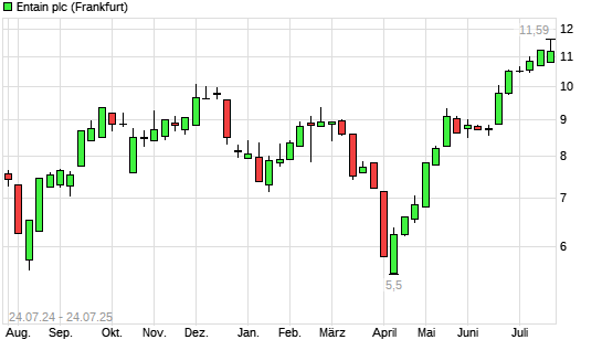 Mit dem Anstieg auf 11,51 EUR hat die Entain-Aktie (ISIN IM00B5VQMV65) am 23.07.2025 ein neues 12-Monats-Hoch erreicht und damit den Kurs vom 22.07.2025 eingestellt.