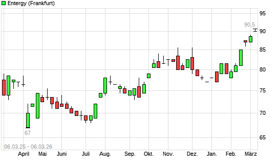 Mit dem Anstieg auf 90,50 EUR hat die Entergy-Aktie (ISIN US29364G1031) am 05.03.2026 ein neues All-Time-High erreicht und damit den Kurs vom 04.03.2026 eingestellt.