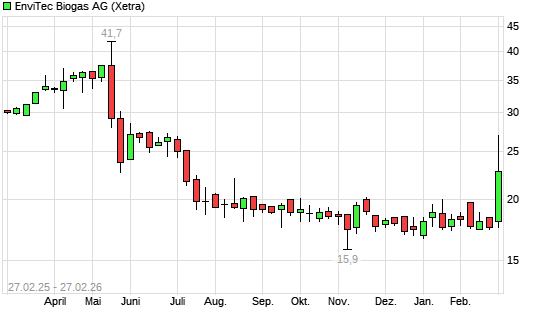Mit dem Anstieg auf 24,70 EUR hat die Envitec Biogas-Aktie (ISIN DE000A0MVLS8) am 26.02.2026 ein neues 6-Monats-Hoch erreicht und damit den Kurs vom 25.02.2026 eingestellt.
