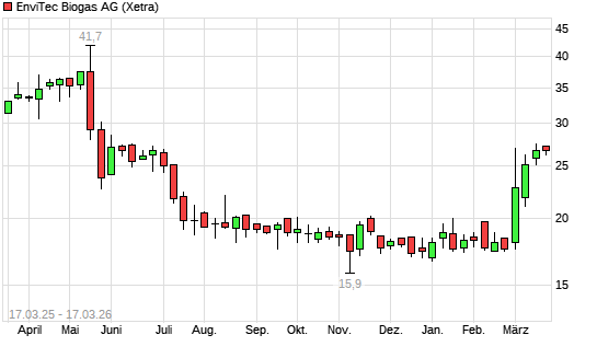 Mit dem Anstieg auf 26,90 EUR hat die Envitec Biogas-Aktie (ISIN DE000A0MVLS8) am 16.03.2026 ein neues 6-Monats-Hoch erreicht und damit den Kurs vom 12.03.2026 eingestellt.