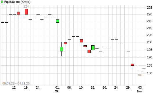 Mit dem Rücksetzer auf 180,00 EUR hat die Equifax-Aktie (ISIN US2944291051) am 03.11.2025 ein neues 12-Monats-Tief erreicht und damit den Kurs vom 07.04.2025 eingestellt.
