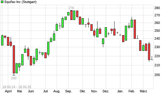 Mit dem Rücksetzer auf 216,00 EUR hat die Equifax-Aktie (ISIN US2944291051) am 17.03.2025 ein neues 6-Monats-Tief erreicht und damit den Kurs vom 13.03.2025 eingestellt.