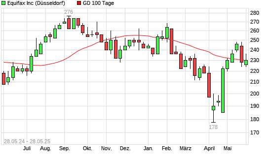Mit dem Rücksetzer auf 230,00 EUR hat die Equifax-Aktie am 27.05.2025 die 100-Tage-Linie nach unten gekreuzt.