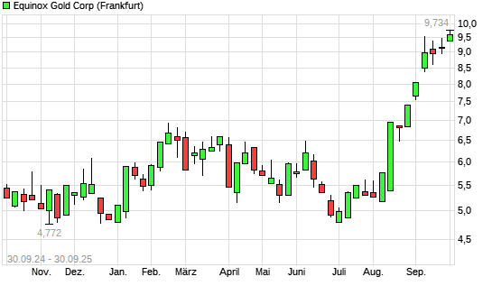 Mit dem Anstieg auf 9,61 EUR hat die Equinox Gold-Aktie (ISIN CA29446Y5020) am 29.09.2025 ein neues 3-Jahres-Hoch erreicht und damit den Kurs vom 15.09.2025 eingestellt.