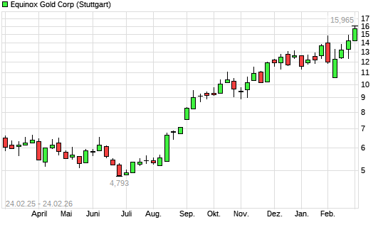 Mit dem Anstieg auf 15,34 EUR hat die Equinox Gold-Aktie (ISIN CA29446Y5020) am 23.02.2026 ein neues All-Time-High erreicht und damit den Kurs vom 20.02.2026 eingestellt.