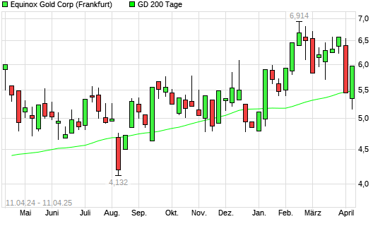 Mit dem Anstieg auf 5,64 EUR hat die Equinox Gold-Aktie am 10.04.2025 die 200-Tage-Linie nach oben gekreuzt.