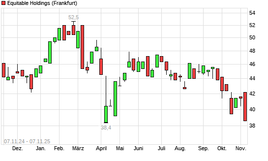 Mit dem Rücksetzer auf 38,60 EUR hat die Equitable Holdings-Aktie (ISIN US29452E1010) am 06.11.2025 ein neues 6-Monats-Tief erreicht und damit den Kurs vom 17.10.2025 eingestellt.