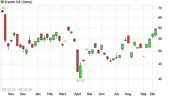 Mit dem Anstieg auf 57,40 EUR hat die Eramet-Aktie (ISIN FR0000131757) am 07.10.2025 ein neues 6-Monats-Hoch erreicht und damit den Kurs vom 28.07.2025 eingestellt.