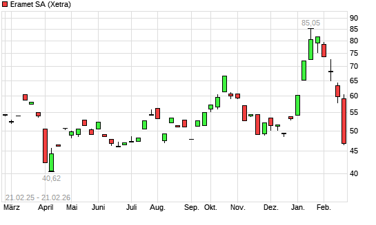 Mit dem Rücksetzer auf 46,64 EUR hat die Eramet-Aktie (ISIN FR0000131757) am 20.02.2026 ein neues 6-Monats-Tief erreicht und damit den Kurs vom 19.02.2026 eingestellt.