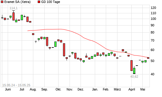 Mit dem Anstieg auf 53,10 EUR hat die Eramet-Aktie am 14.05.2025 die 100-Tage-Linie nach oben gekreuzt.