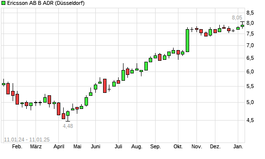 Mit dem Anstieg auf 8,00 EUR hat die Ericsson B ADR-Aktie (ISIN US2948216088) am 10.01.2025 ein neues 12-Monats-Hoch erreicht und damit den Kurs vom 06.12.2024 eingestellt.