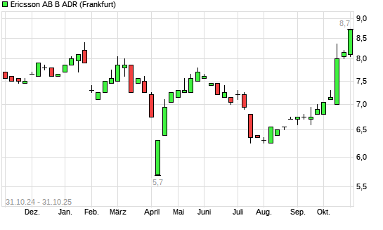 Mit dem Anstieg auf 8,60 EUR hat die Ericsson B ADR-Aktie (ISIN US2948216088) am 30.10.2025 ein neues 3-Jahres-Hoch erreicht und damit den Kurs vom 15.10.2025 eingestellt.