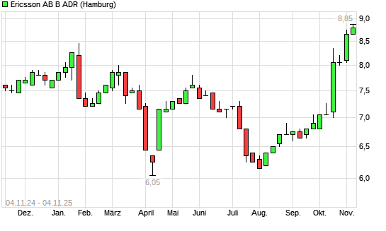 Mit dem Anstieg auf 9,10 EUR hat die Ericsson B ADR-Aktie (ISIN US2948216088) am 03.11.2025 ein neues 3-Jahres-Hoch erreicht und damit den Kurs vom 31.10.2025 eingestellt.