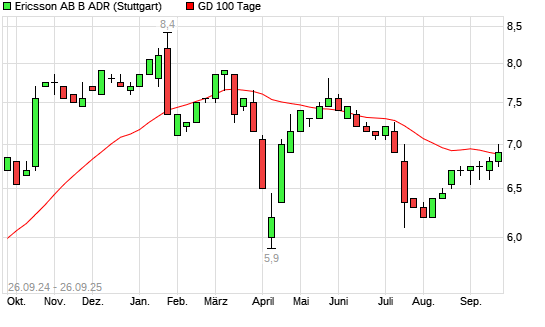 Mit dem Rücksetzer auf 6,90 EUR hat die Ericsson B ADR-Aktie am 25.09.2025 die 100-Tage-Linie nach unten gekreuzt.