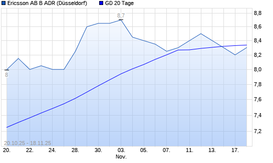 Mit dem Rücksetzer auf 8,35 EUR hat die Ericsson B ADR-Aktie am 17.11.2025 die 20-Tage-Linie nach unten gekreuzt.