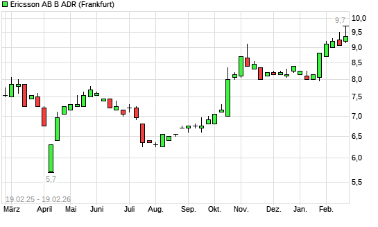 Mit dem Anstieg auf 9,55 EUR hat die Ericsson B ADR-Aktie (ISIN US2948216088) am 18.02.2026 ein neues 3-Jahres-Hoch erreicht und damit den Kurs vom 09.02.2026 eingestellt.Die Ericsson ...weiterlesen