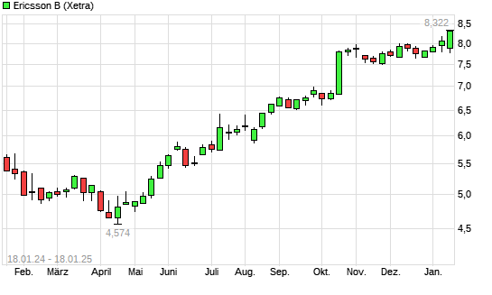 Mit dem Anstieg auf 8,31 EUR hat die Ericsson B-Aktie (ISIN SE0000108656) am 17.01.2025 ein neues 12-Monats-Hoch erreicht und damit den Kurs vom 15.01.2025 eingestellt.