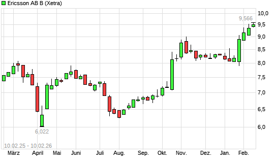 Mit dem Anstieg auf 9,50 EUR hat die Ericsson B-Aktie (ISIN SE0000108656) am 09.02.2026 ein neues 3-Jahres-Hoch erreicht und damit den Kurs vom 05.02.2026 eingestellt.