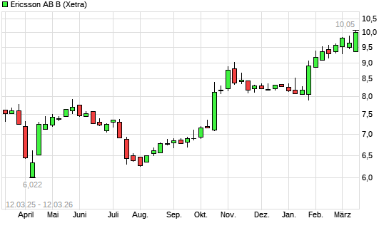 Mit dem Anstieg auf 9,96 EUR hat die Ericsson B-Aktie (ISIN SE0000108656) am 11.03.2026 ein neues 3-Jahres-Hoch erreicht und damit den Kurs vom 10.03.2026 eingestellt.