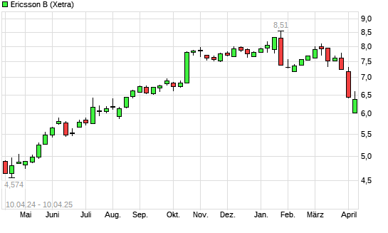 Mit dem Rücksetzer auf 6,11 EUR hat die Ericsson B-Aktie (ISIN SE0000108656) am 09.04.2025 ein neues 6-Monats-Tief erreicht und damit den Kurs vom 08.04.2025 eingestellt.