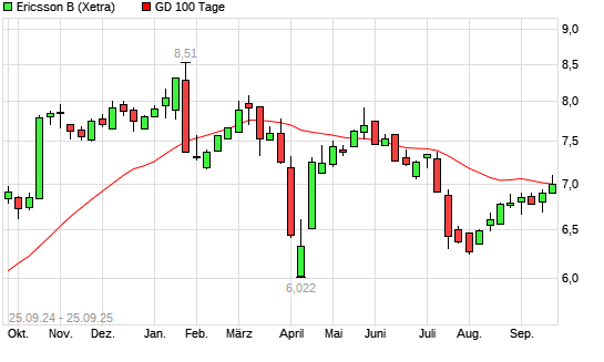 Mit dem Rücksetzer auf 7,01 EUR hat die Ericsson B-Aktie am 24.09.2025 die 100-Tage-Linie nach unten gekreuzt.