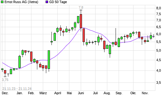 Mit dem Anstieg auf 5,82 EUR hat die Ernst Russ-Aktie am 20.11.2024 die 50-Tage-Linie nach oben gekreuzt.