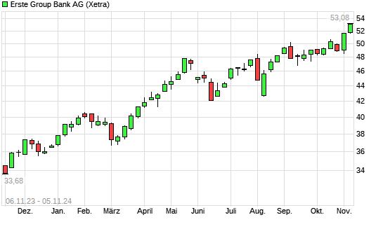 Mit dem Anstieg auf 51,40 EUR hat die Erste Group-Aktie (ISIN AT0000652011) am 04.11.2024 ein neues 10-Jahres-Hoch erreicht und damit den Kurs vom 01.11.2024 eingestellt.