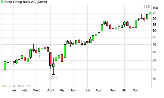 Mit dem Anstieg auf 98,10 EUR hat die Erste Group-Aktie (ISIN AT0000652011) am 05.12.2025 ein neues All-Time-High erreicht und damit den Kurs vom 03.12.2025 eingestellt.