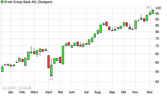 Mit dem Anstieg auf 99,00 EUR hat die Erste Group-Aktie (ISIN AT0000652011) am 10.12.2025 ein neues All-Time-High erreicht und damit den Kurs vom 05.12.2025 eingestellt.