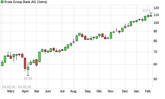 Mit dem Anstieg auf 111,00 EUR hat die Erste Group-Aktie (ISIN AT0000652011) am 03.02.2026 ein neues All-Time-High erreicht und damit den Kurs vom 28.01.2026 eingestellt.