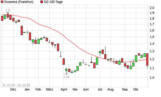 Mit dem Rücksetzer auf 1,10 EUR hat die Essentra-Aktie am 30.10.2025 die 100-Tage-Linie nach unten gekreuzt.