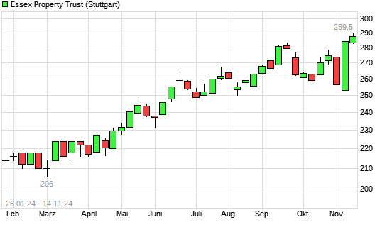 Mit dem Anstieg auf 289,90 EUR hat die Essex Property Trust-Aktie (ISIN US2971781057) am 13.11.2024 ein neues 12-Monats-Hoch erreicht und damit den Kurs vom 11.11.2024 eingestellt.