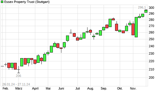 Mit dem Anstieg auf 294,10 EUR hat die Essex Property Trust-Aktie (ISIN US2971781057) am 26.11.2024 ein neues 12-Monats-Hoch erreicht und damit den Kurs vom 25.11.2024 eingestellt.