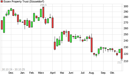 Mit dem Rücksetzer auf 212,40 EUR hat die Essex Property Trust-Aktie (ISIN US2971781057) am 29.10.2025 ein neues 12-Monats-Tief erreicht und damit den Kurs vom 11.08.2025 eingestellt.