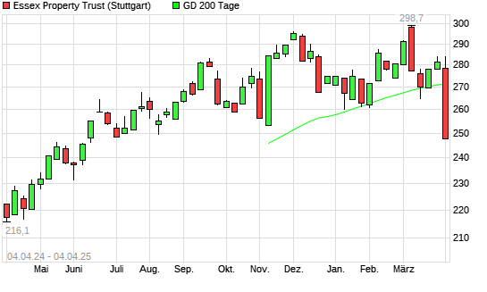 Mit dem Rücksetzer auf 266,80 EUR hat die Essex Property Trust-Aktie am 03.04.2025 die 200-Tage-Linie nach unten gekreuzt.