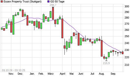 Mit dem Rücksetzer auf 224,50 EUR hat die Essex Property Trust-Aktie am 02.10.2025 die 50-Tage-Linie nach unten gekreuzt.