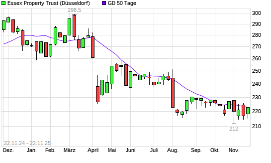 Mit dem Anstieg auf 225,70 EUR hat die Essex Property Trust-Aktie am 21.11.2025 die 50-Tage-Linie nach oben gekreuzt.Die Essex Property Trust-Aktie befindet sich seit dem 03.04.2025 im langfristigen ...weiterlesen