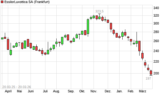 Mit dem Rücksetzer auf 197,00 EUR hat die EssilorLuxottica-Aktie (ISIN FR0000121667) am 19.03.2026 ein neues 12-Monats-Tief erreicht und damit den Kurs vom 18.03.2026 eingestellt.