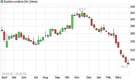 Mit dem Rücksetzer auf 193,50 EUR hat die EssilorLuxottica-Aktie (ISIN FR0000121667) am 23.03.2026 ein neues 12-Monats-Tief erreicht und damit den Kurs vom 20.03.2026 eingestellt.