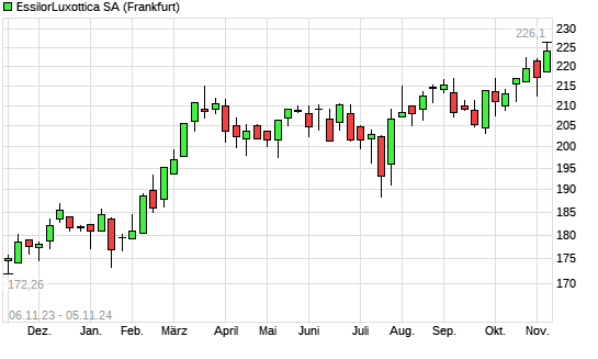 Mit dem Anstieg auf 224,00 EUR hat die EssilorLuxottica-Aktie (ISIN FR0000121667) am 04.11.2024 ein neues All-Time-High erreicht und damit den Kurs vom 22.10.2024 eingestellt.