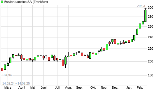Mit dem Anstieg auf 295,00 EUR hat die EssilorLuxottica-Aktie (ISIN FR0000121667) am 13.02.2025 ein neues All-Time-High erreicht und damit den Kurs vom 12.02.2025 eingestellt.
