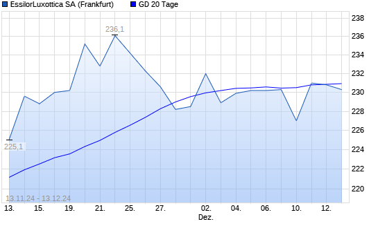 Mit dem Rücksetzer auf 230,80 EUR hat die EssilorLuxottica-Aktie am 12.12.2024 die 20-Tage-Linie nach unten gekreuzt.