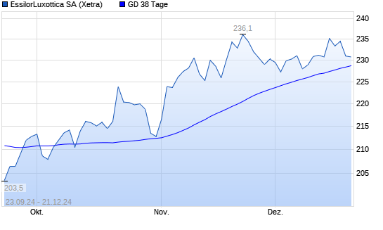 Mit dem Rücksetzer auf 228,80 EUR hat die EssilorLuxottica-Aktie am 20.12.2024 die 38-Tage-Linie nach unten gekreuzt.