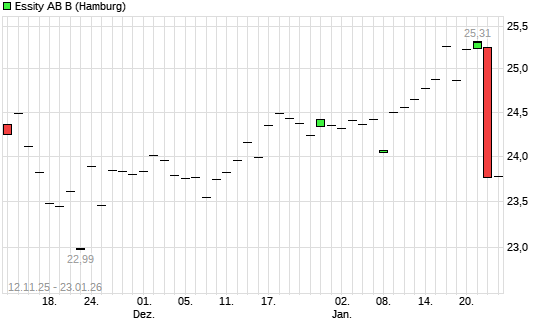 Mit dem Anstieg auf 25,50 EUR hat die Essity AB B-Aktie (ISIN SE0009922164) am 22.01.2026 ein neues 6-Monats-Hoch erreicht und damit den Kurs vom 20.01.2026 eingestellt.
