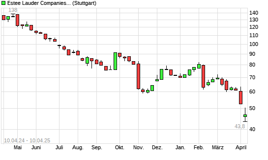 Mit dem Rücksetzer auf 45,40 EUR hat die Estee Lauder Companies-Aktie (ISIN US5184391044) am 09.04.2025 ein neues 10-Jahres-Tief erreicht und damit den Kurs vom 08.04.2025 eingestellt.