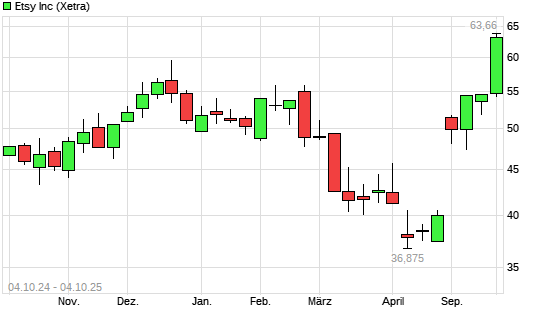 Mit dem Anstieg auf 63,91 EUR hat die Etsy-Aktie (ISIN US29786A1060) am 03.10.2025 ein neues 12-Monats-Hoch erreicht und damit den Kurs vom 02.10.2025 eingestellt.